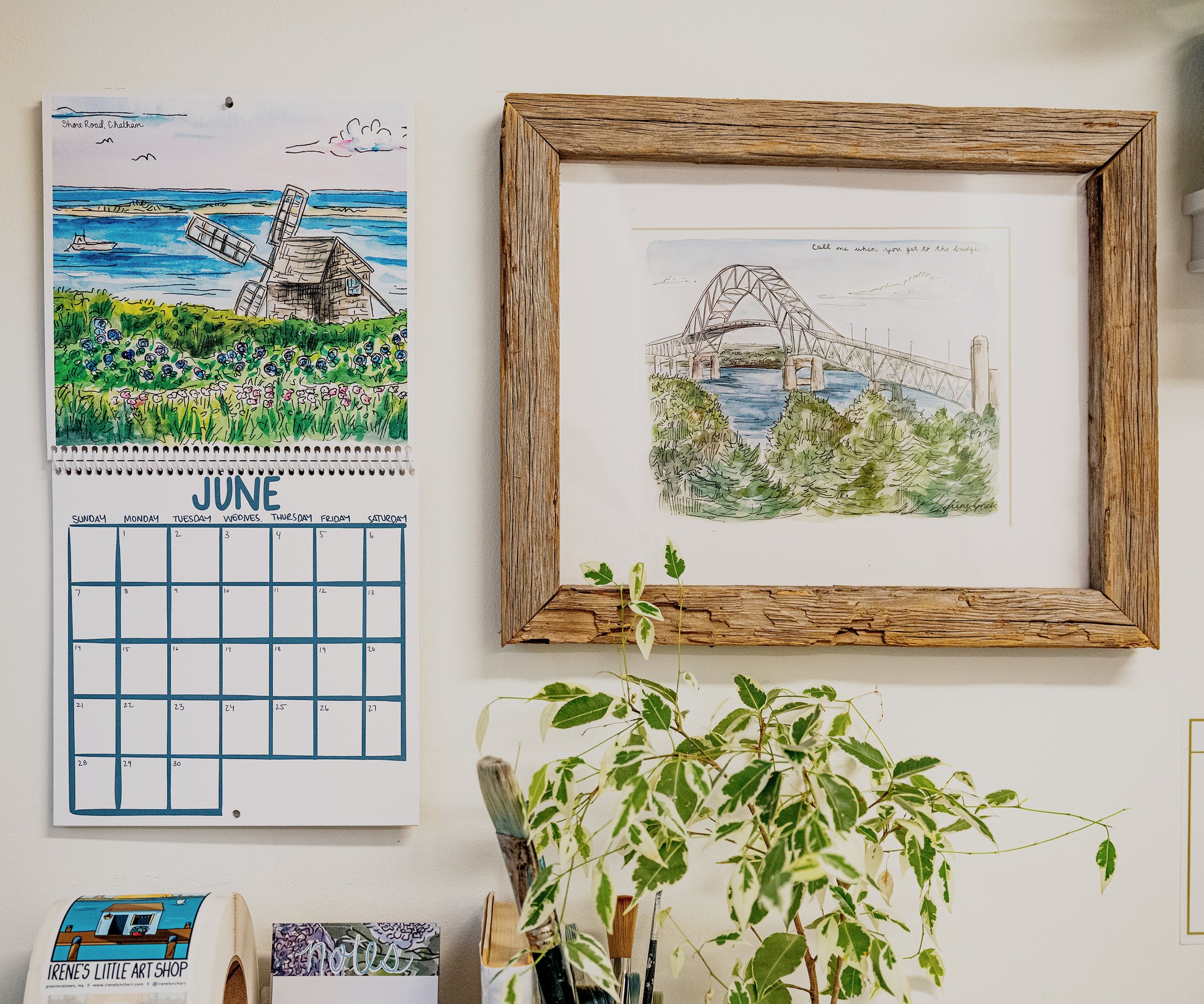 Each page includes hand-drawn calendar designs paired with Irene’s signature coastal artwork — capturing the charm, nostalgia, and everyday beauty of Cape Cod life.