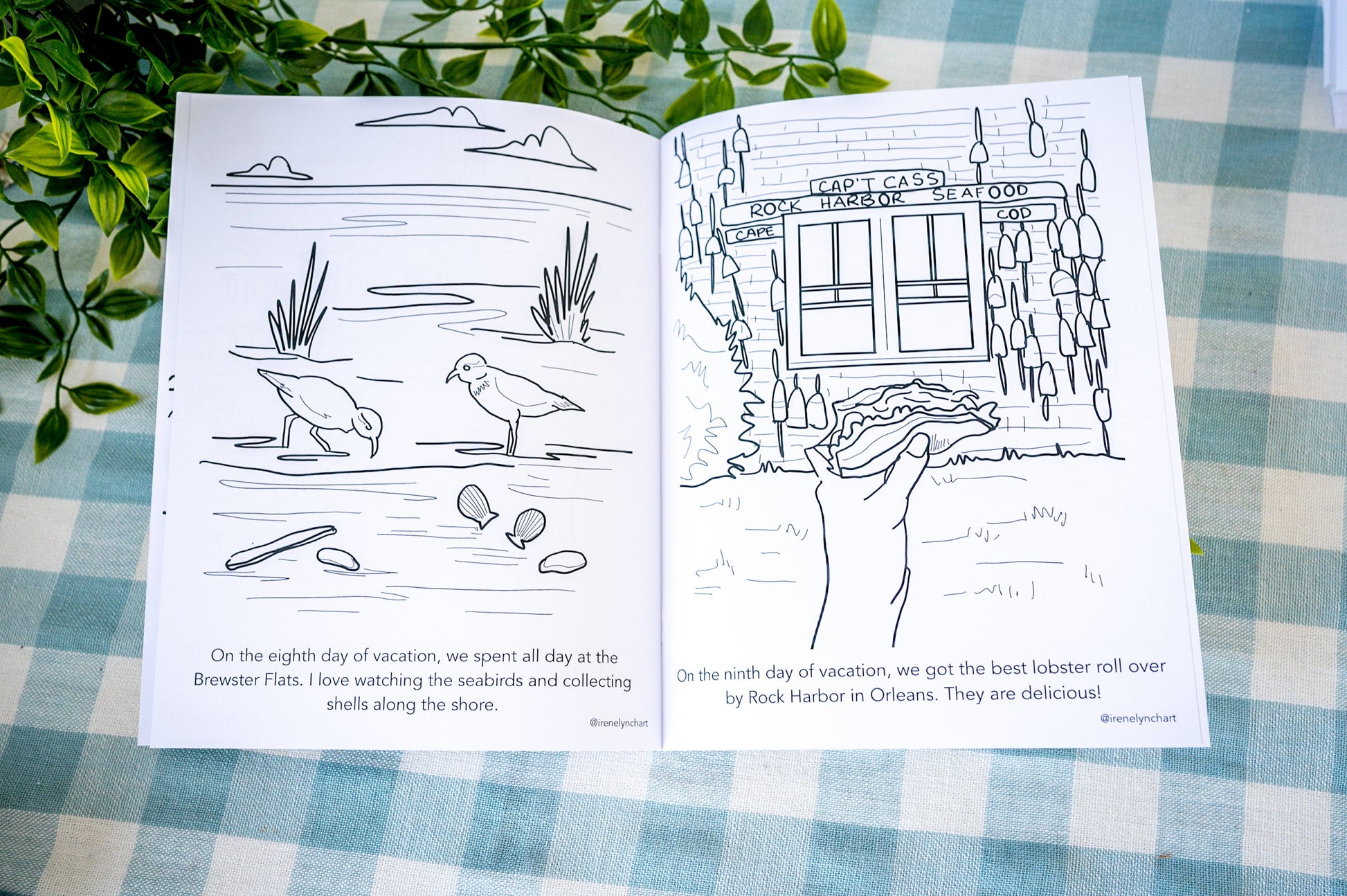 This 13 page coloring book features 11 hand drawn illustrations alongside a story recounting the perfect Cape Cod vacation. Each page features a different town and a new summer activity.