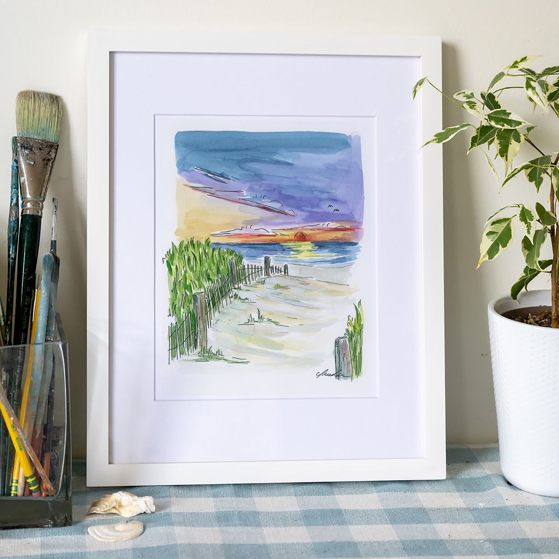 Original watercolor and ink illustration of a sunset path on Cape Cod