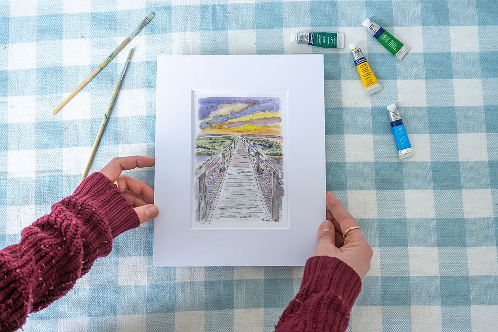 Original watercolor and ink illustration of Gray’s Beach boardwalk over the marsh at sunset