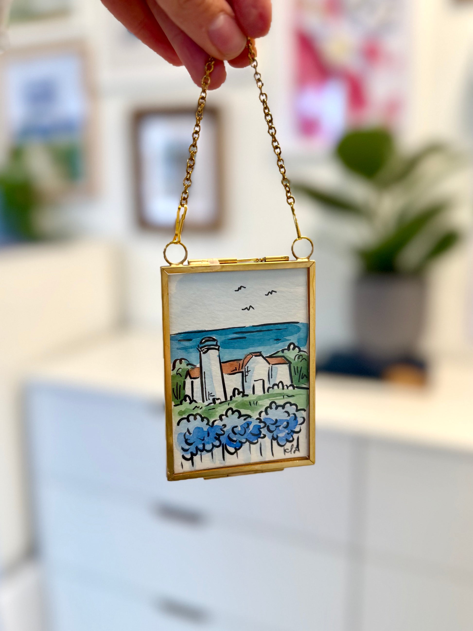 Each tiny framed watercolor is a completely original hand-painted piece — no prints here! Measuring around 2" x 3", these mini paintings come ready to hang with a delicate gold hanging frame, perfect for a small wall space, shelf display, or even as a keepsake ornament.
