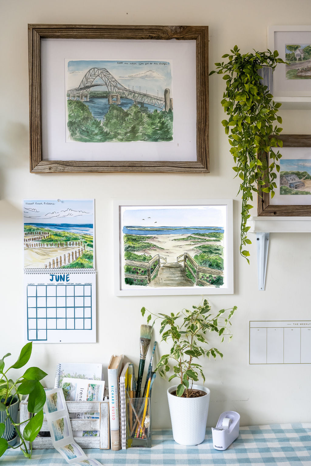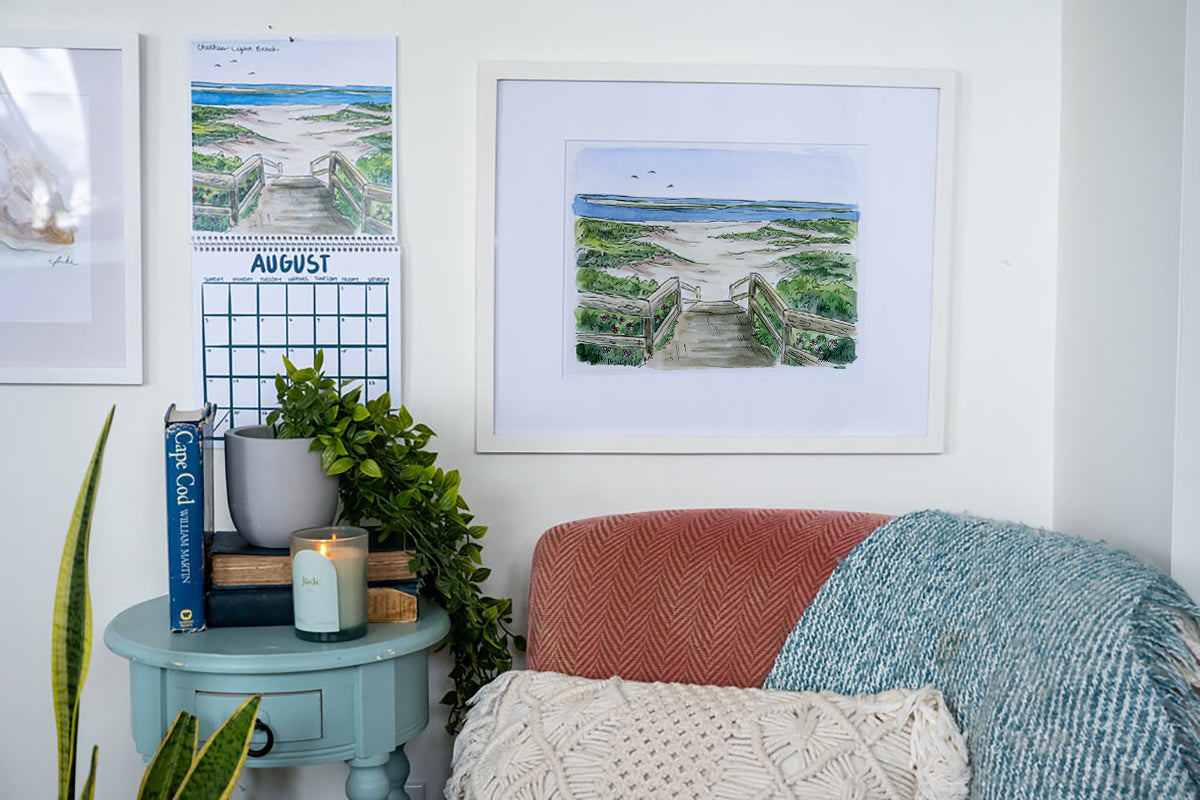 Step into the peaceful beauty of Cape Cod with this hand-illustrated watercolor and ink print of the iconic stairs leading down to Chatham Light Beach.