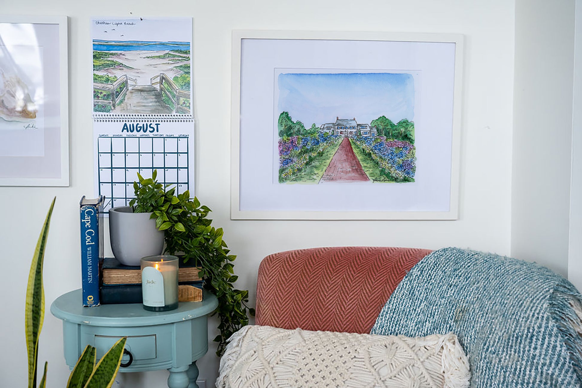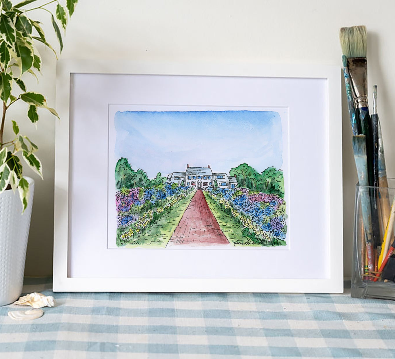Bring the beauty of Cape Cod into your home with this charming art print of Chatham’s beloved Hydrangea House, painted in watercolor and ink by artist Irene Lynch. With its classic seaside architecture framed by vibrant summer blooms, this piece captures the essence of a Cape Cod summer. Perfect for Chatham lovers, hydrangea admirers, or anyone who dreams of a coastal getaway. Makes a thoughtful gift for beach house owners, gardeners, or Cape Cod vacationers.