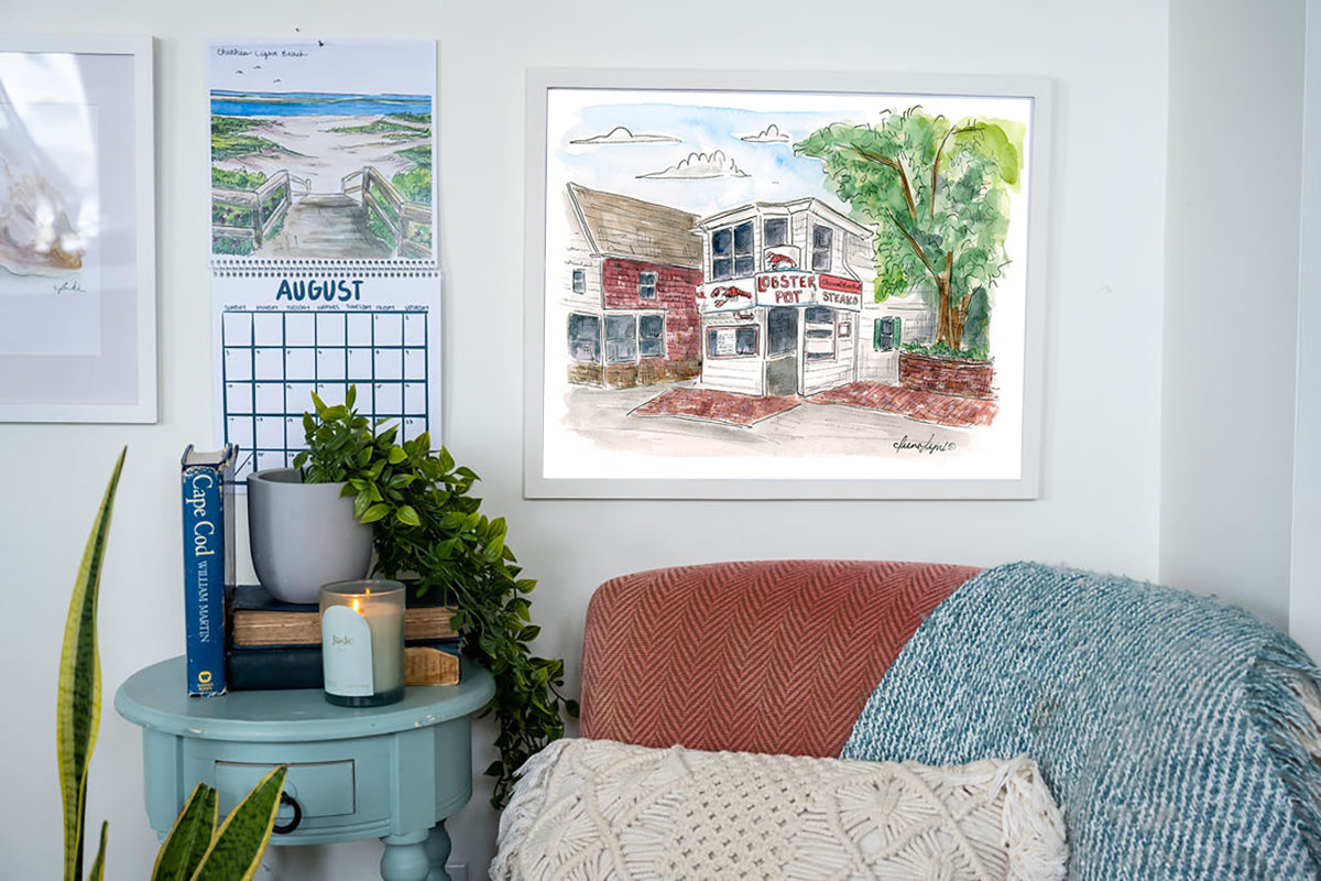 This original watercolor and ink print of The Lobster Pot captures the colorful charm of one of Cape Cod’s most beloved landmarks. Whether you’ve stood in line for a lobster roll or just love the energy of Commercial Street, this piece brings Ptown’s flavor and personality home.