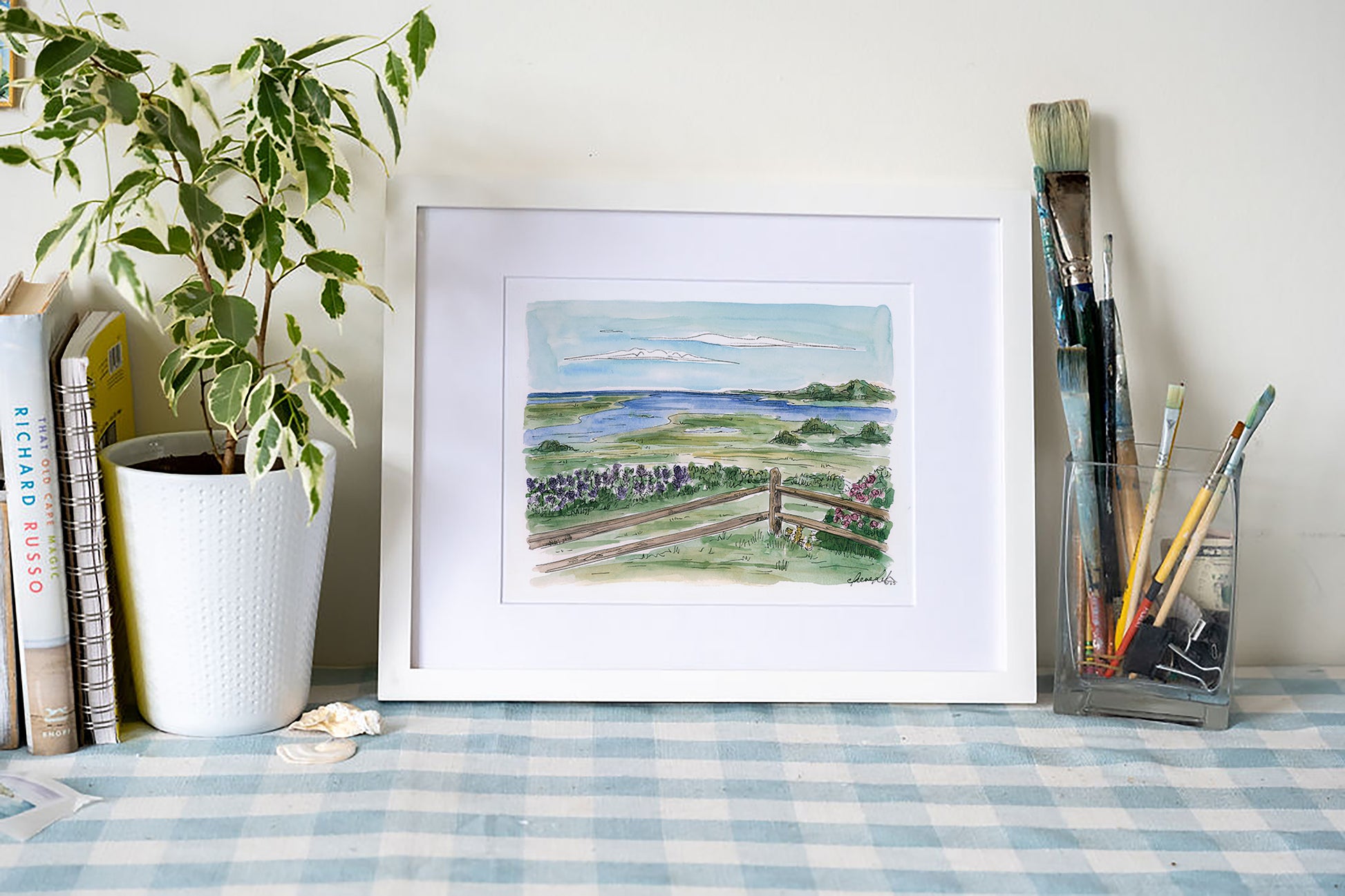 Capture the peaceful beauty of Eastham with this watercolor and ink art print, painted by Irene Lynch, featuring the scenic views from Fort Hill. Overlooking sweeping salt marshes, winding trails, and the glistening horizon, this piece evokes the magic of quiet moments surrounded by Cape Cod’s natural landscapes. Known for its breathtaking sunsets and serene walking paths, Fort Hill is a treasured spot for locals and visitors alike. Perfect for Cape Cod lovers, nature enthusiasts, or anyone who cherishes the Outer Cape. A thoughtful gift for vacationers, bird watchers, or those who dream of Eastham’s coastal beauty.