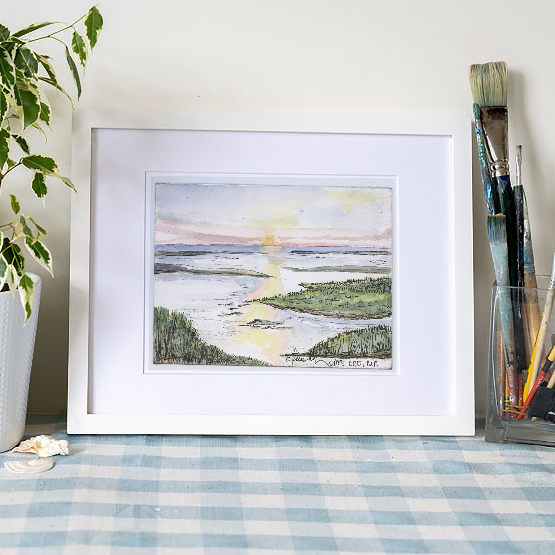 Original watercolor and ink illustration of a Cape Cod Bay sunset