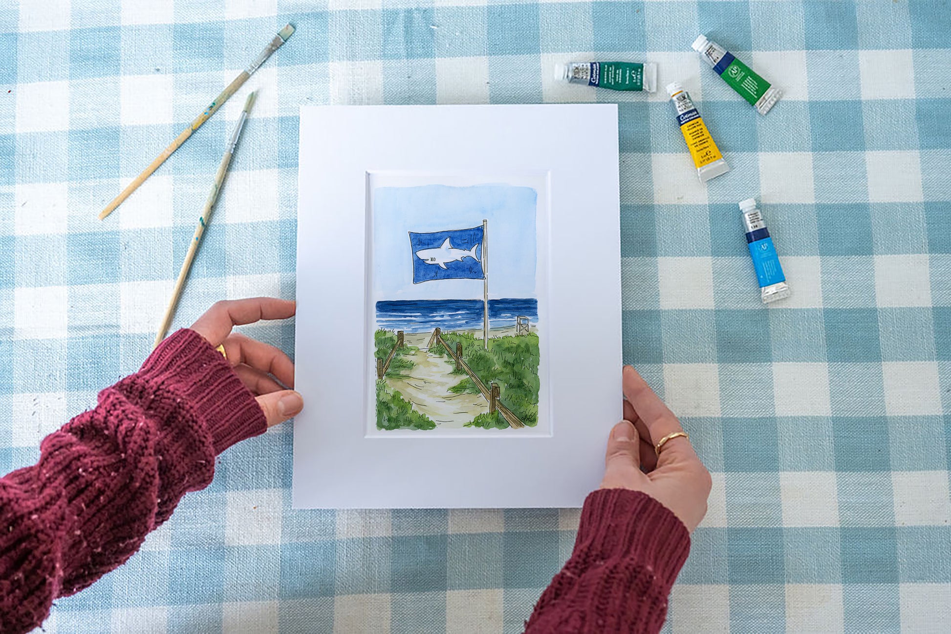 Capture the beauty of the Cape with this art print of the iconic shark flag at Nauset Beach, painted in watercolor and ink by Cape Cod artist Irene Lynch. This coastal wall art embodies the essence of a summer day on the Outer Cape—salty air, rolling surf, and the ever-present reminder that you’re sharing the sea with something powerful just below the surface.