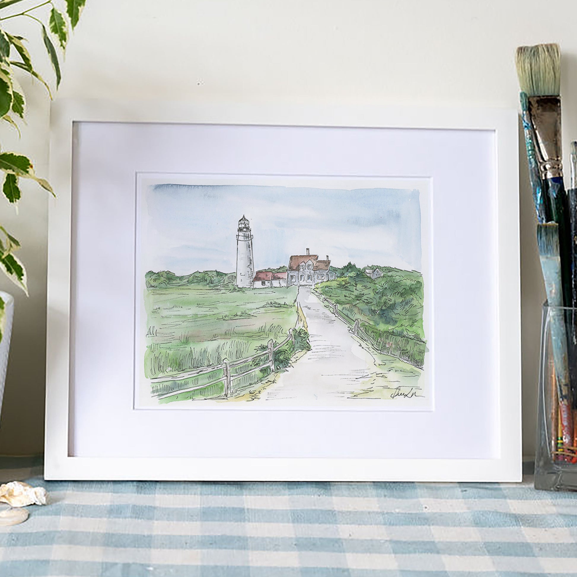 Celebrate one of Cape Cod’s most iconic lighthouses with this watercolor and ink art print by Irene Lynch, featuring Highland Light in Truro. Perched atop the dramatic cliffs of the Outer Cape, the lighthouse is depicted surrounded by rolling dunes, coastal grasses, and the expansive Atlantic horizon, capturing the timeless beauty and maritime charm of the Cape.