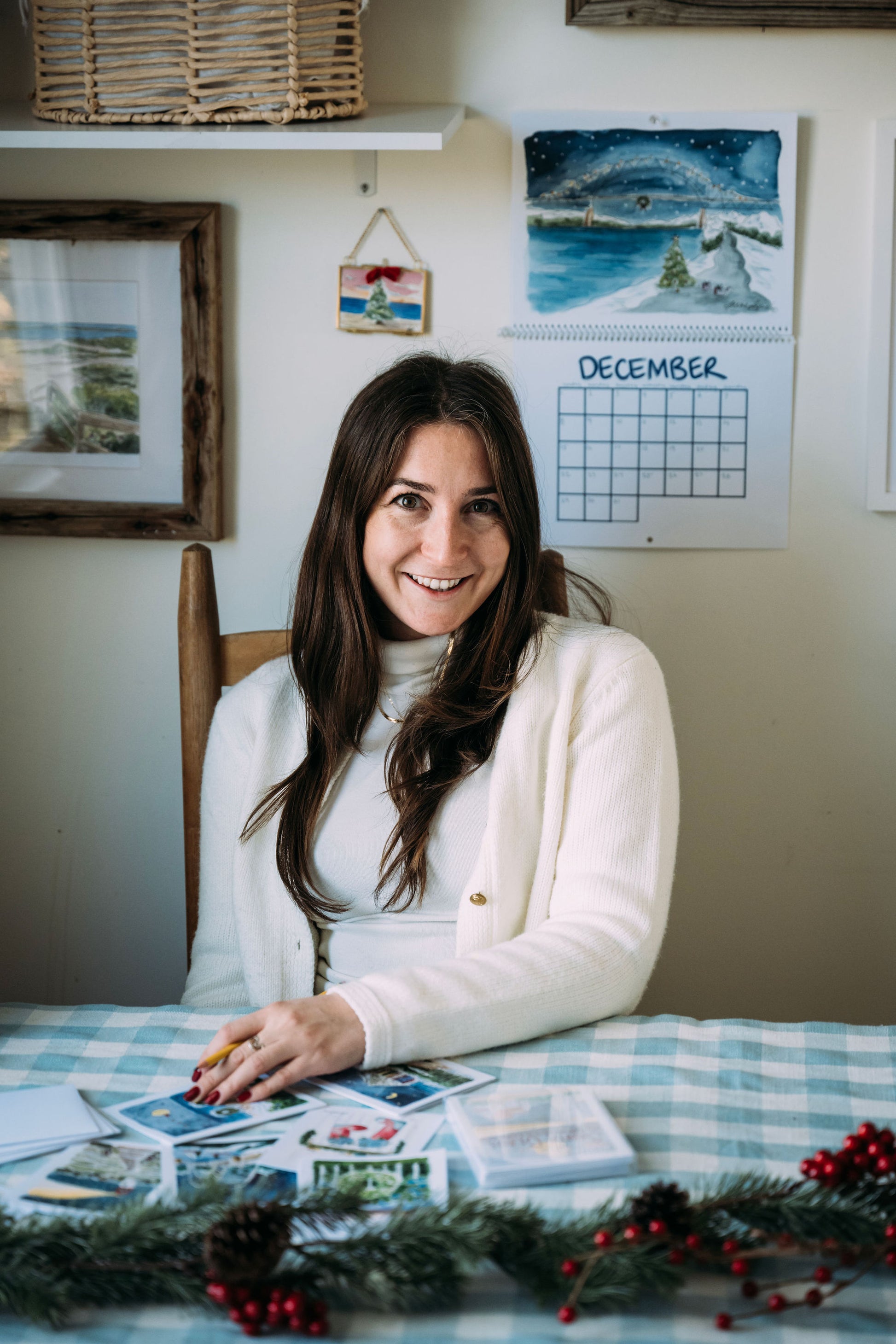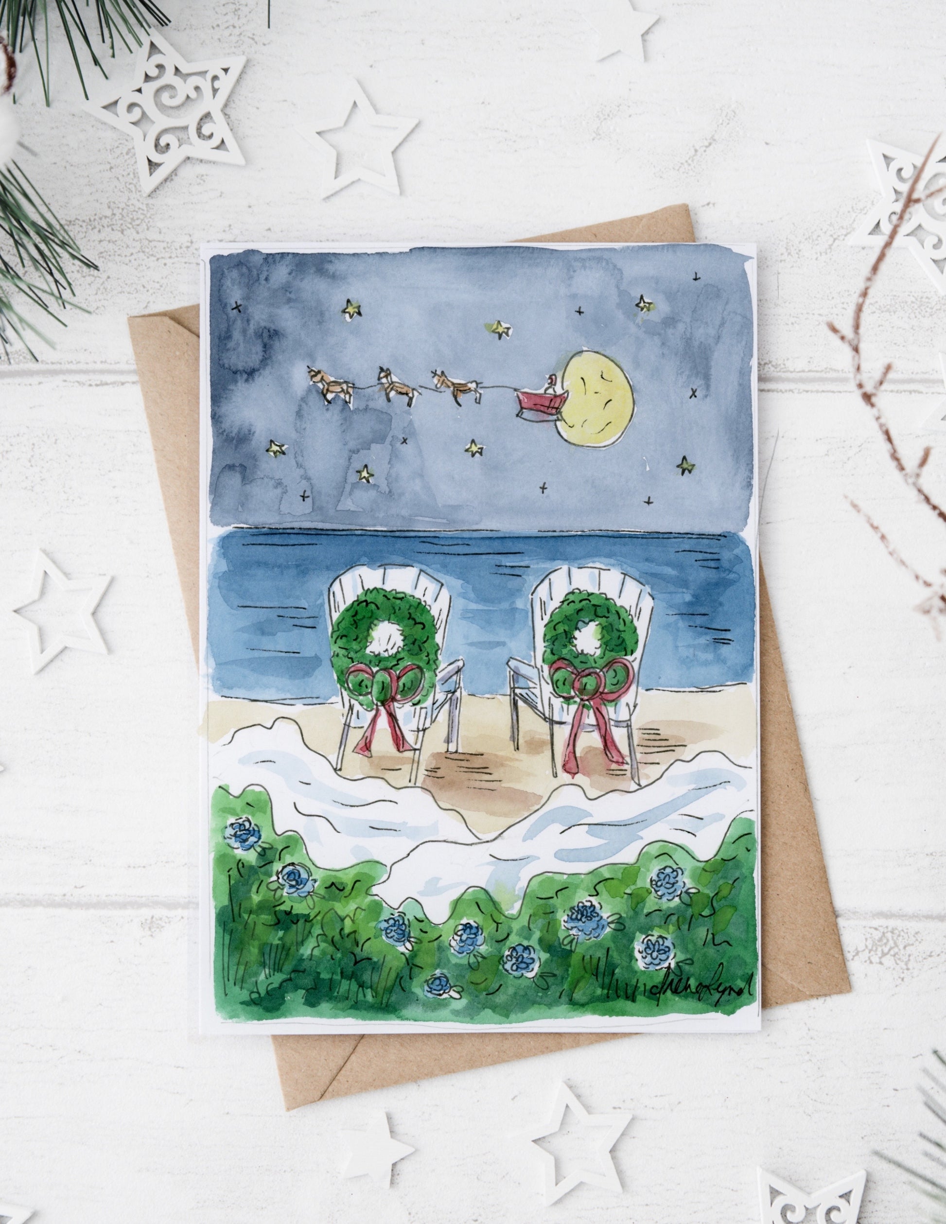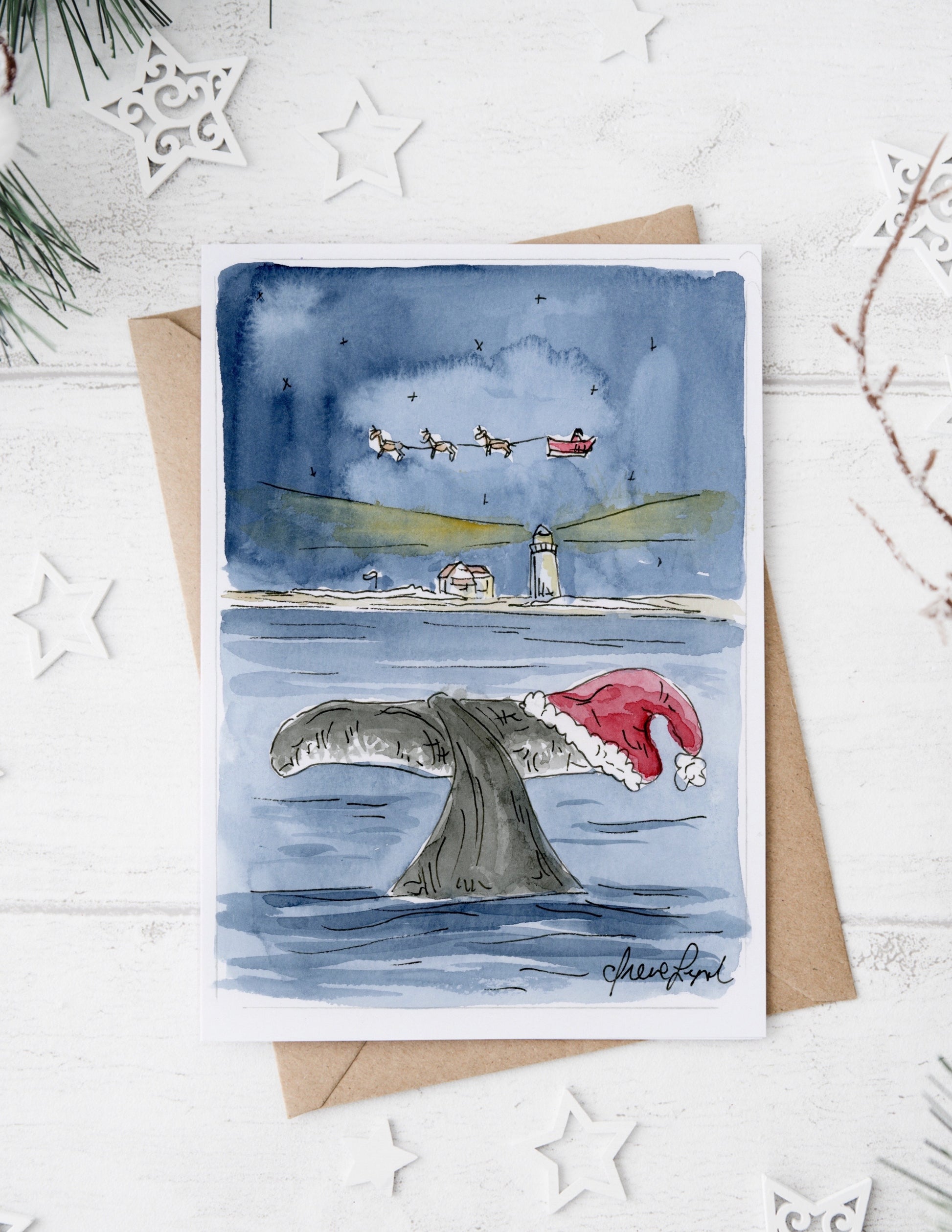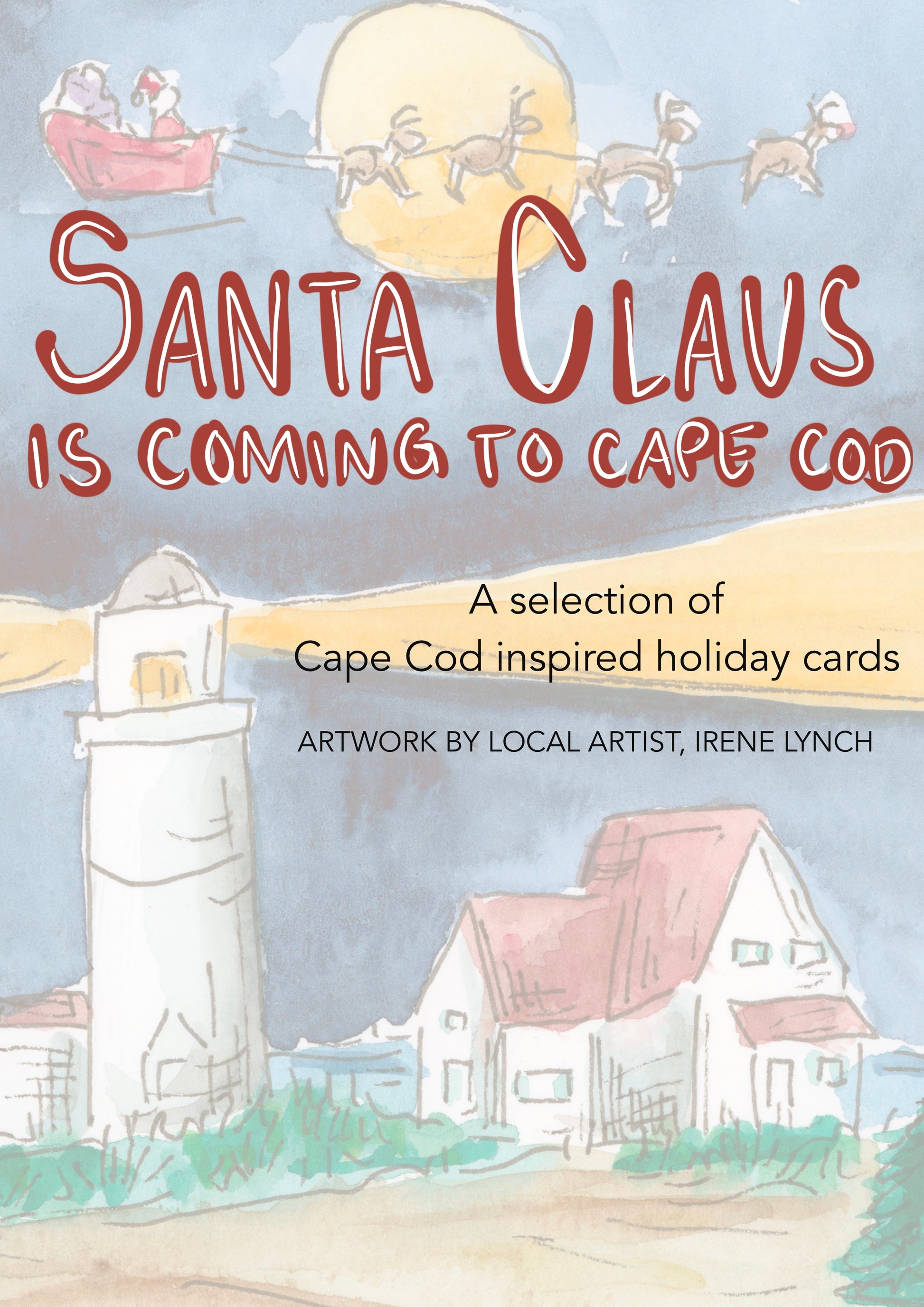 This is a collection of holiday cards containing a variety of watercolor and ink paintings depicting Christmas by the sea on the Cape. Each card is 4"x6" and paired with an envelope. The inside of the card is empty, and the back has a small logo of Irene Lynch Art.