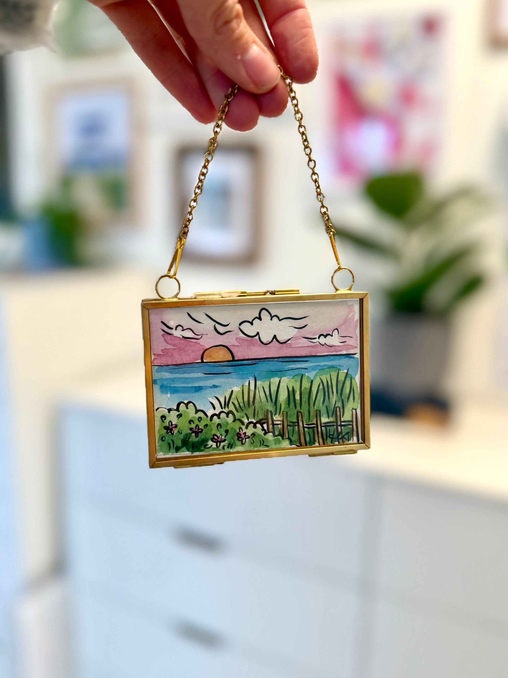 Each tiny framed watercolor is a completely original hand-painted piece — no prints here! Measuring around 2" x 3", these mini paintings come ready to hang with a delicate gold hanging frame, perfect for a small wall space, shelf display, or even as a keepsake ornament.